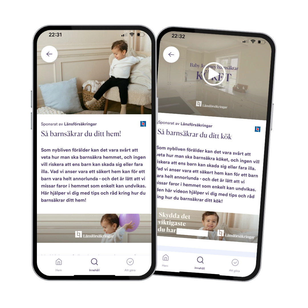 Som komplement till de rörliga produktionerna skapades även artiklar och checklistor i Baby Journeys gravidapp. Det redaktionella innehållet anpassades i språk, stil och design för att vara tilltalande för målgruppen.
