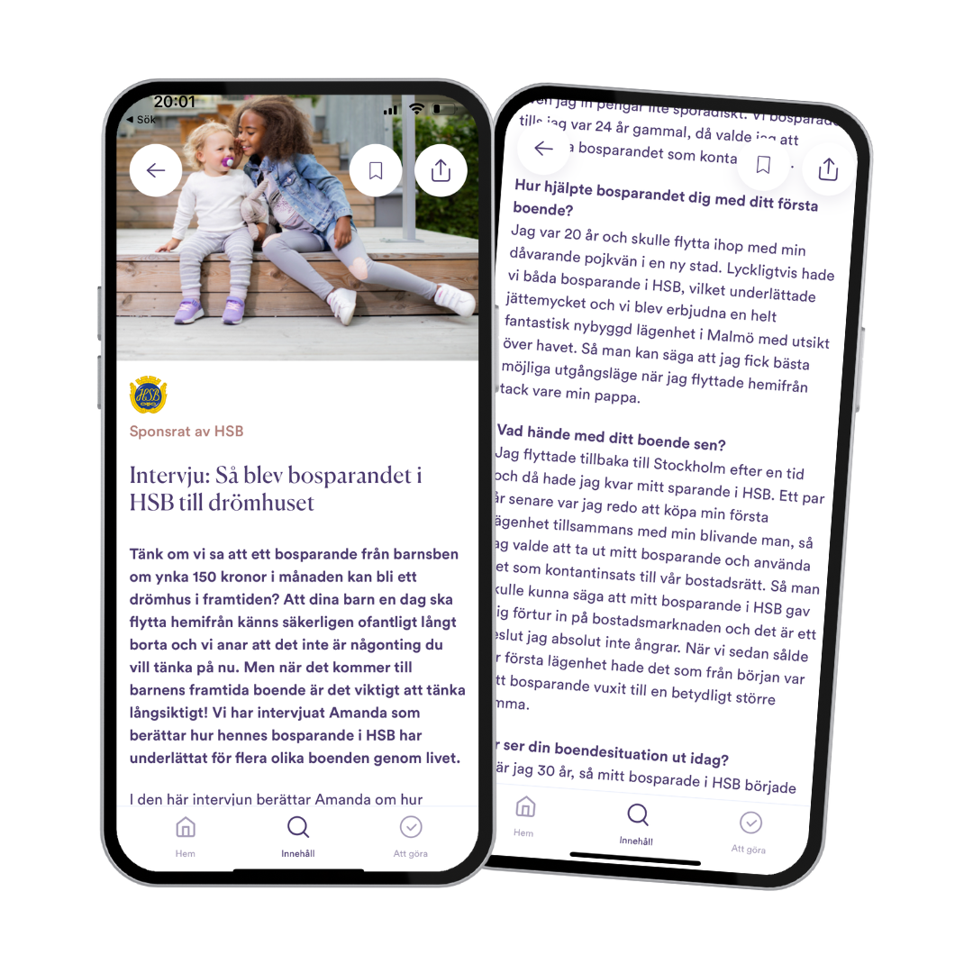 Vi valde att visualisera vad ett långsiktigt sparande till ens barn kan leda till för att göra något som ligger långt fram i tiden mer greppbart. Det gjorde vi genom att låta artikeln bli en personlig intervju med en 30-åring vars föräldrar bosparat via HSB. Genom att visa att en liten summa per månad har lett till någons första hyresrätt, första bostadsköp och slutligen drömhus inspirerade och motiverade vi målgruppen till handling. Som call to action till HSBs egna landningssidor om bosparande marknadsfördes även en tävling där priset var 100 000:- i kontantinsats för barnets framtida boende. Artikeln placerades i appens kategori som berör ekonomi och föräldraskap för att användare som söker denna typ av inspiration lätt skulle hitta den.