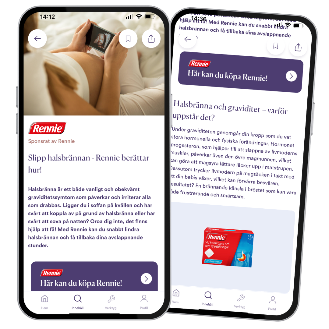 Rennie är ett läkemedel som lindrar halsbränna, ett vanligt besvär under graviditeten som över 80 % av användarna i Baby Journey uppger att de drabbas av. Utmaningen för Rennie är att många inte känner till varumärket när behovet uppstår. För att bygga kännedom tidigt i graviditeten har Rennie valt att samarbeta med Baby Journey – som möter gravida först av alla.