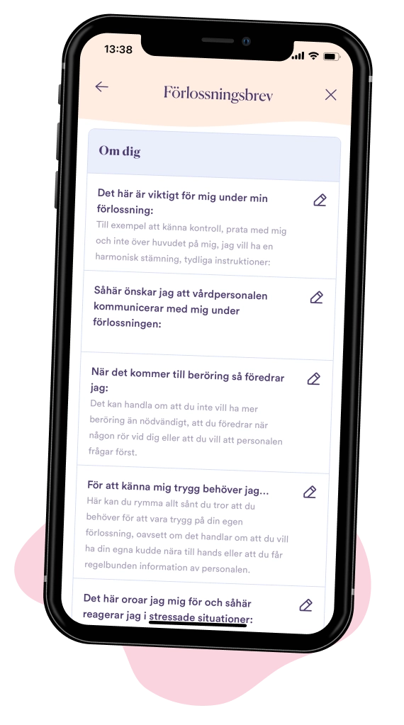 What is important to you during childbirth? Communicate all your thoughts to the healthcare professionals through your birth letter. We will guide you through all the important questions that will help the health professionals to give you the best conditions for a safe experience.